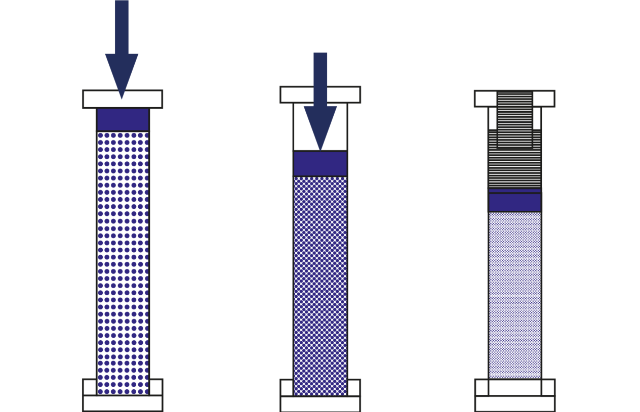 MODcol® Spring® Columns represent the next generation of preparative and semi-preparative chromatography. By integrating a patented internal Dynamic Axial Compression mechanism, they solve all major limitations of traditional fixed-bed column packing. While fixed-bed columns often suffer from void formation, bed relaxation and channeling — leading to reduced efficiency and unstable retention times — Spring Columns maintain constant compression throughout operation. This ensures a perfectly stable packed bed from the first injection to thousands of runs.